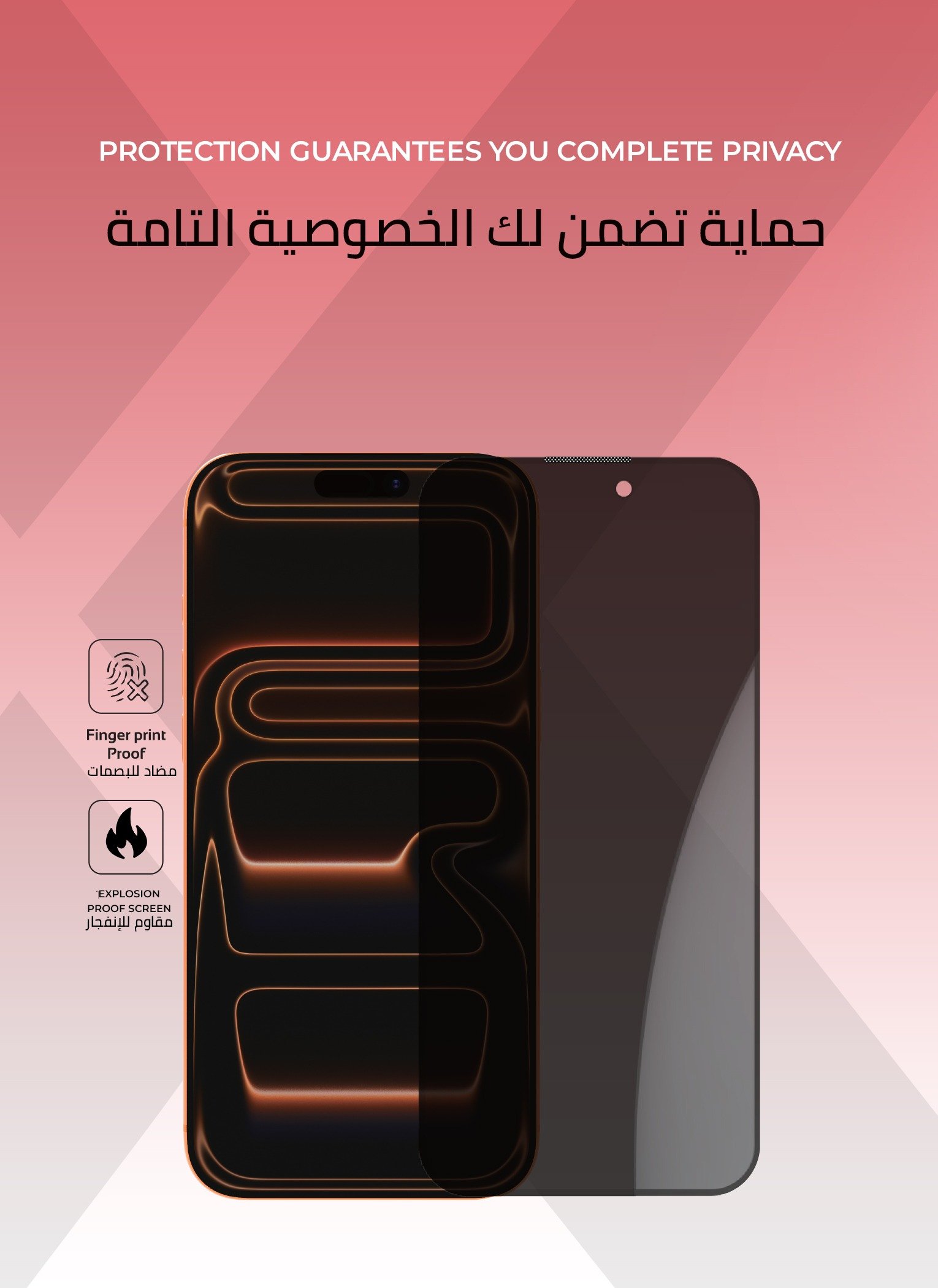 • طقم حماية متكامل (غطاء خلفي + واقي شاشة Privacy + حماية للكاميرا).